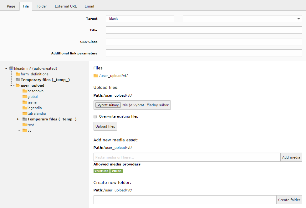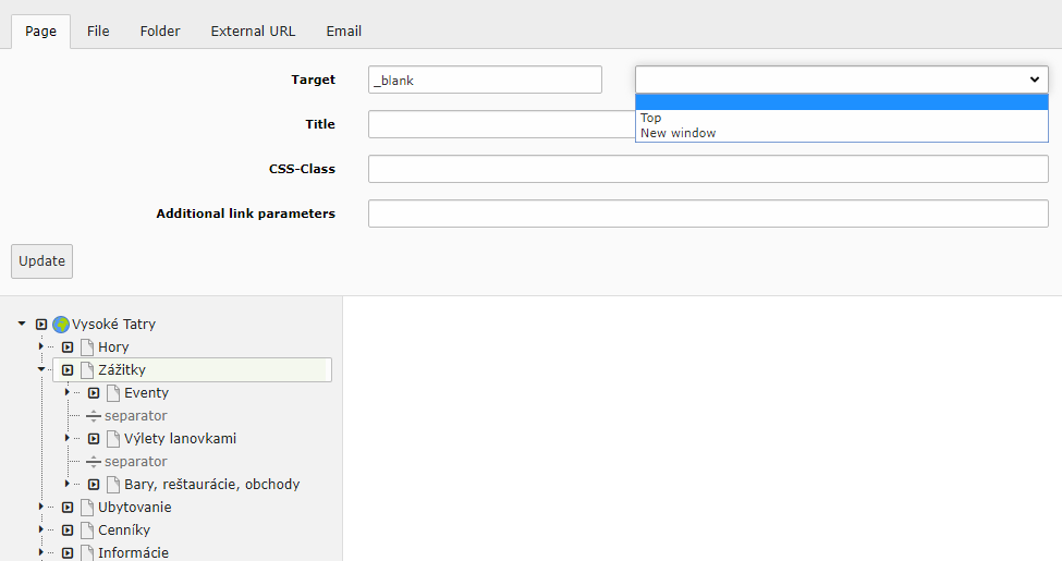 Page: Interný link v rámci Typo3, tam kde máme prístup. Klikom na názov stránky zvolíme odkaz. Vždy môžeme prispôsobiť otvorenie v New windows (_blank) alebo v tom istom okne Top (_top)