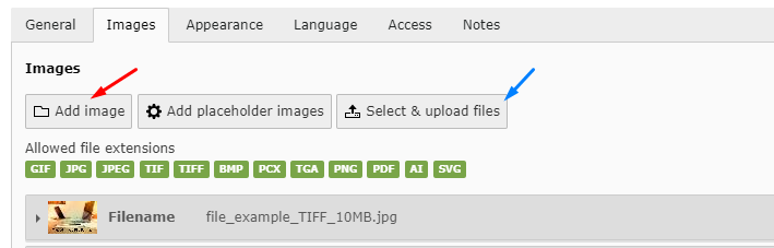 Nahrať obrázky môžeme cez “Select & upload files“. Vtedy nahrávame obrázky priamo do prednastaveného priečinka na servery zo svojho počítača.