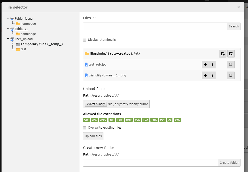 Cez “Add image” sa nám otvorí nové okno, vľavo máme priečinky kde máme prístup. Vpravo list súborov, nahranie súborov a možné doplnenie priečinka v aktuálne zvolenom priečinku.