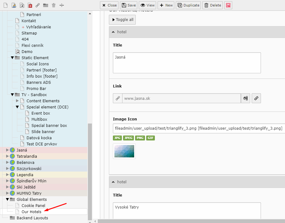 Je vytvorený nový priečinok pre Globálne prvky ako sú Cookie Bar a Our Hotels. Môžu editovať iba administrátori.